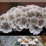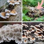 The split gill also has false gills on the underside of a bracket-like cap, like the crimped gill. This can cause a lot of confusion. To separate these two, you need to closely investigate the folds of the false gills on each species. With the split gill, each “gill” is split down the middle lengthwise, giving it a distinctive forked channel appearance. The split gill is also whitish to grayish overall and has a much rougher, hairier cap surface, compared to the more brownish, orange-zoned cap of the crimped gill.