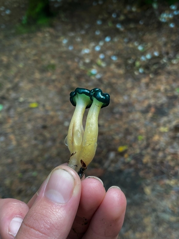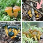 - Chicken lips, Jelly baby, Green jelly drops (Leotia viscosa) – Dark green cap and yellow stem