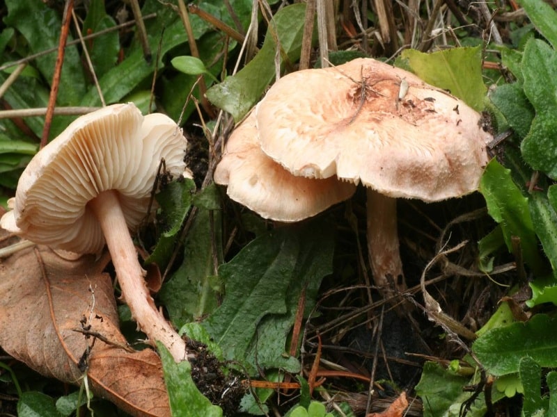 Pluteus species, often called deer or shield mushrooms, have free gills that aren’t attached to the stem, like Lepiota, and a cap that ranges from convex to flat. The primary difference is that Pluteus species do not have partial veils or a ring around the upper stem. Pluteus mushrooms also typically grow on rotting wood or woody debris, rather than directly on soil. Finally, their spore print is pinkish to salmon-colored, not white like Lepiota species.