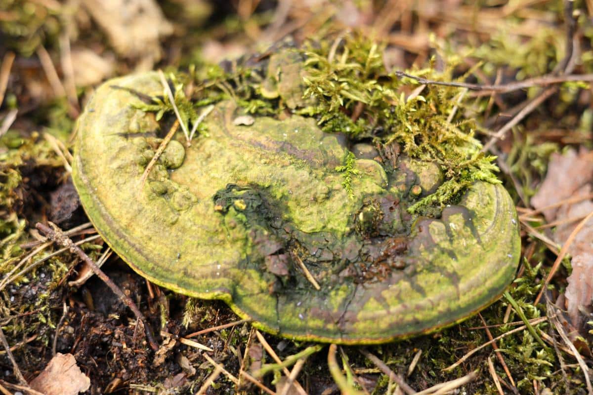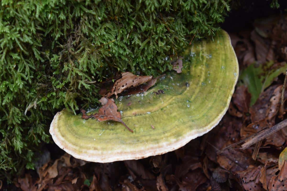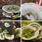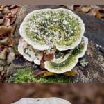 Turkey tails also do not usually get taken over by algae, so they will rarely be green like the lumpy bracket mushroom. Finally, the underside of the turkey tail is white with tiny, round pores. These are noticeably different from the lumpy bracket’s pores, which are bigger, rectangular, and form maze-like patterns.