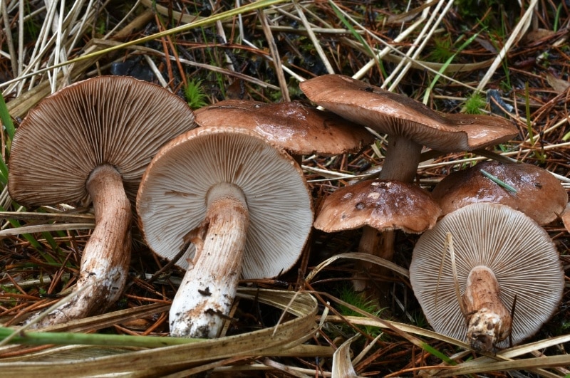 There are literally hundreds of Cortinarius species, and some of them look a lot like the poison pie. Many of them are brownish, medium-sized mushrooms with brownish gills that grow on the ground. Many Cortinarius species are toxic (or deadly), so they shouldn’t be collected for the table.
