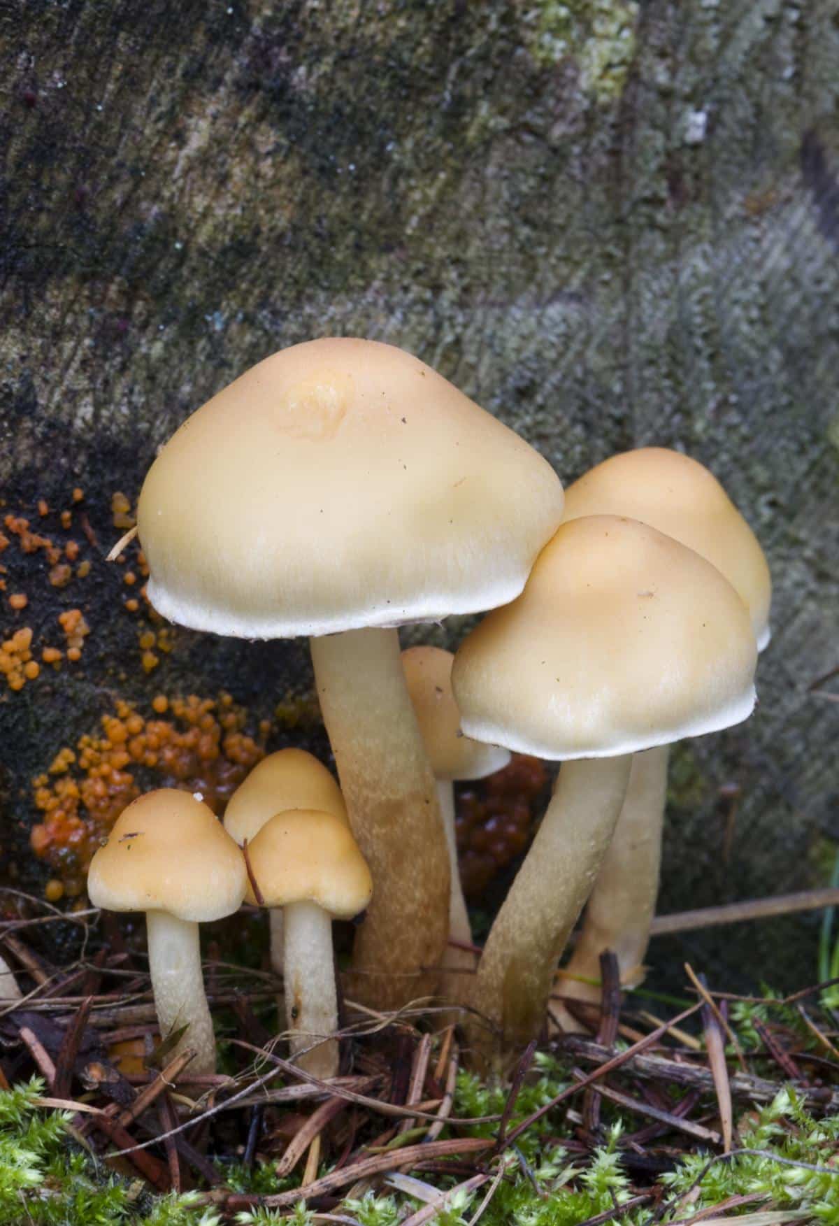 The edible honey mushroom is occasionally mistaken for poison pie. Honey mushrooms also have golden-brown caps with sticky surfaces when wet. The key differences are that they grow in dense clusters on wood. And, many honey mushroom species have a ring on the stem that easily sets them apart. The smell is also a key difference. Armillaria has a sweet, nutty aroma, not anything radish-like. A final difference is the spore print — Honey mushrooms have white spores, while poison pie produces brown spores.