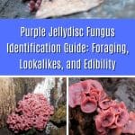 The budding jellydisc is probably the trickiest lookalike because it belongs to the same genus and has a similar purple color. The main difference is that the budding jellydisc is only ever cup-shaped. It does not form the brain-like, gelatinous blobs that the purple jellydisc forms when young.