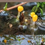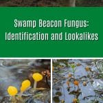 These two can grow in the same kind of habitat, and are both small aquatic fungi with a yellow to orange or reddish head on a pale stem. The key difference is color. The head of water club mushroom tends toward orange or reddish-orange rather than the clean, bright yellow of the swamp beacon.