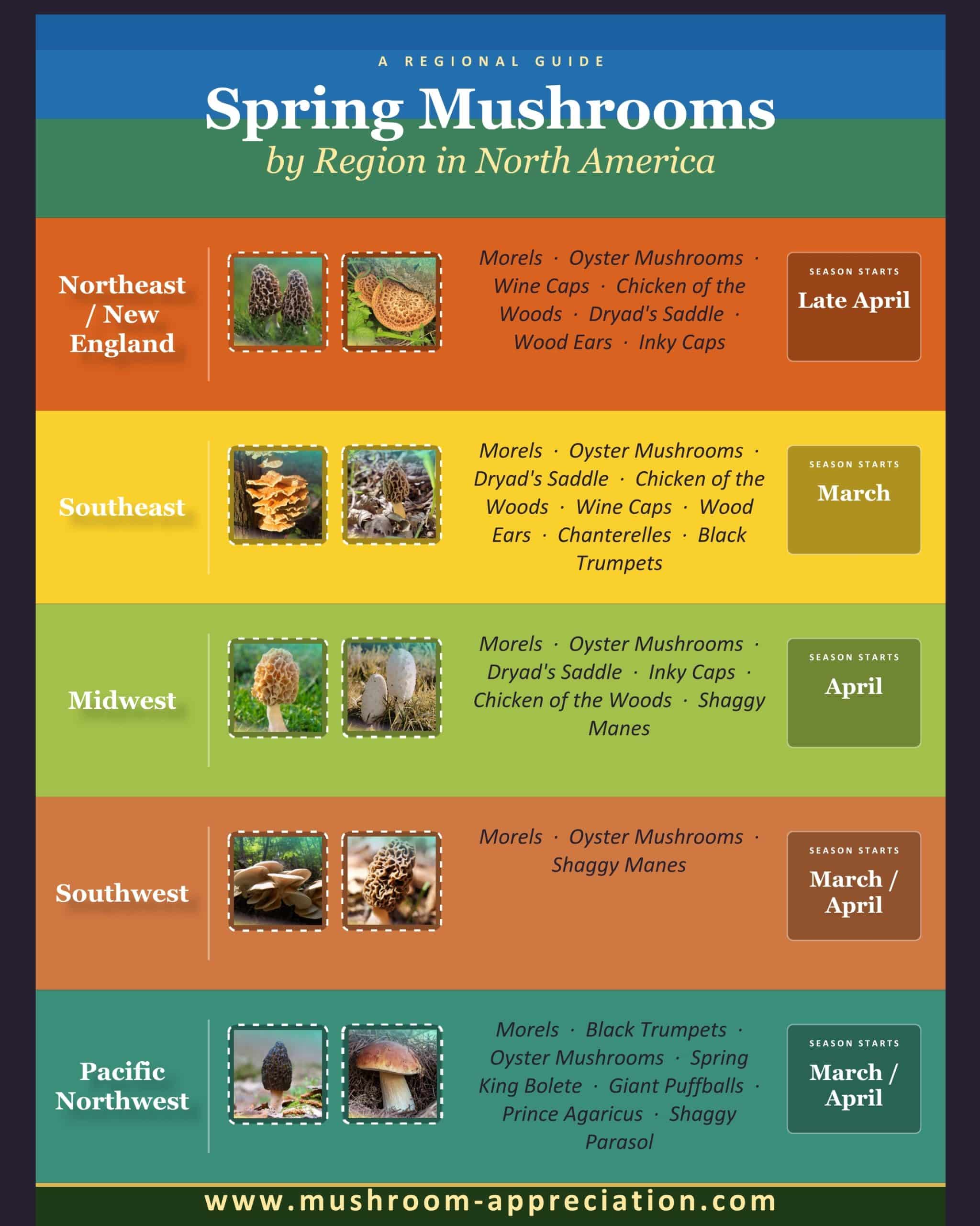 The key to successful mushroom foraging is knowing what grows when and where in your region, and focusing on those species. This guide covers what mushrooms grow in spring in all regions across the United States.
